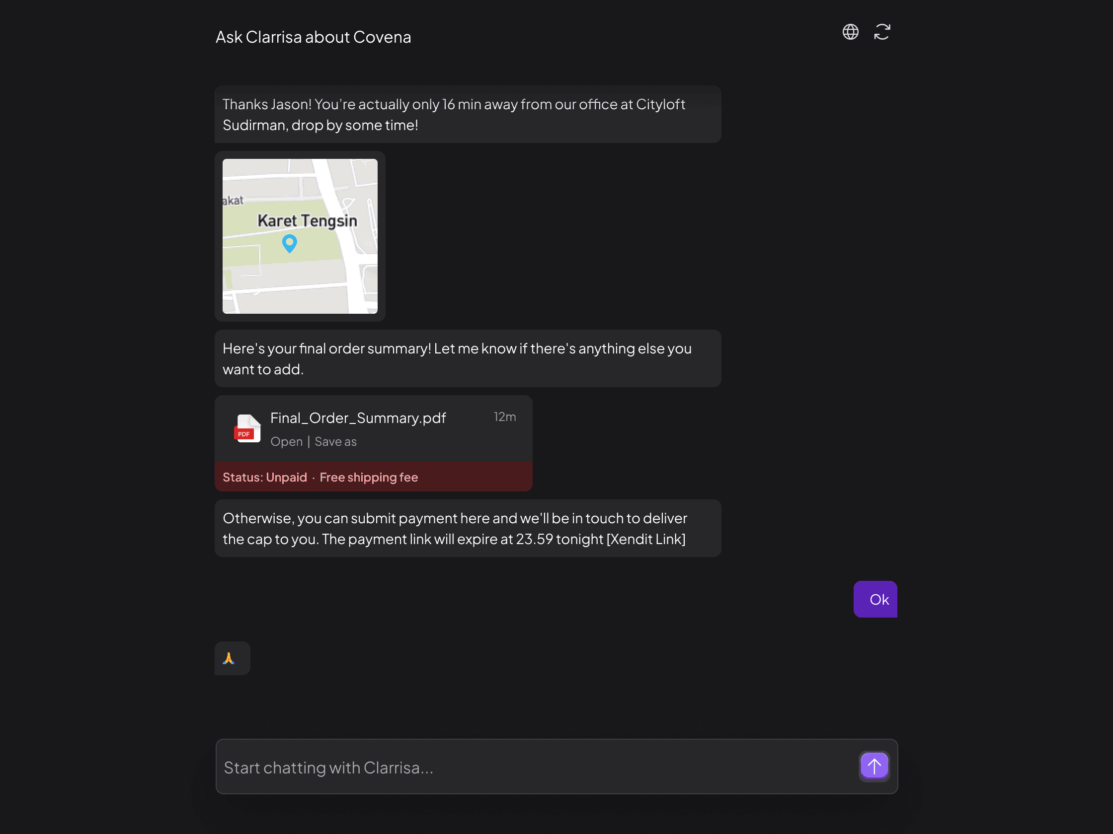 Covena's AI worked with your everyday apps like WhatsApp, Xendit, Google sheets, Gmail and more to streamline and grow your business.